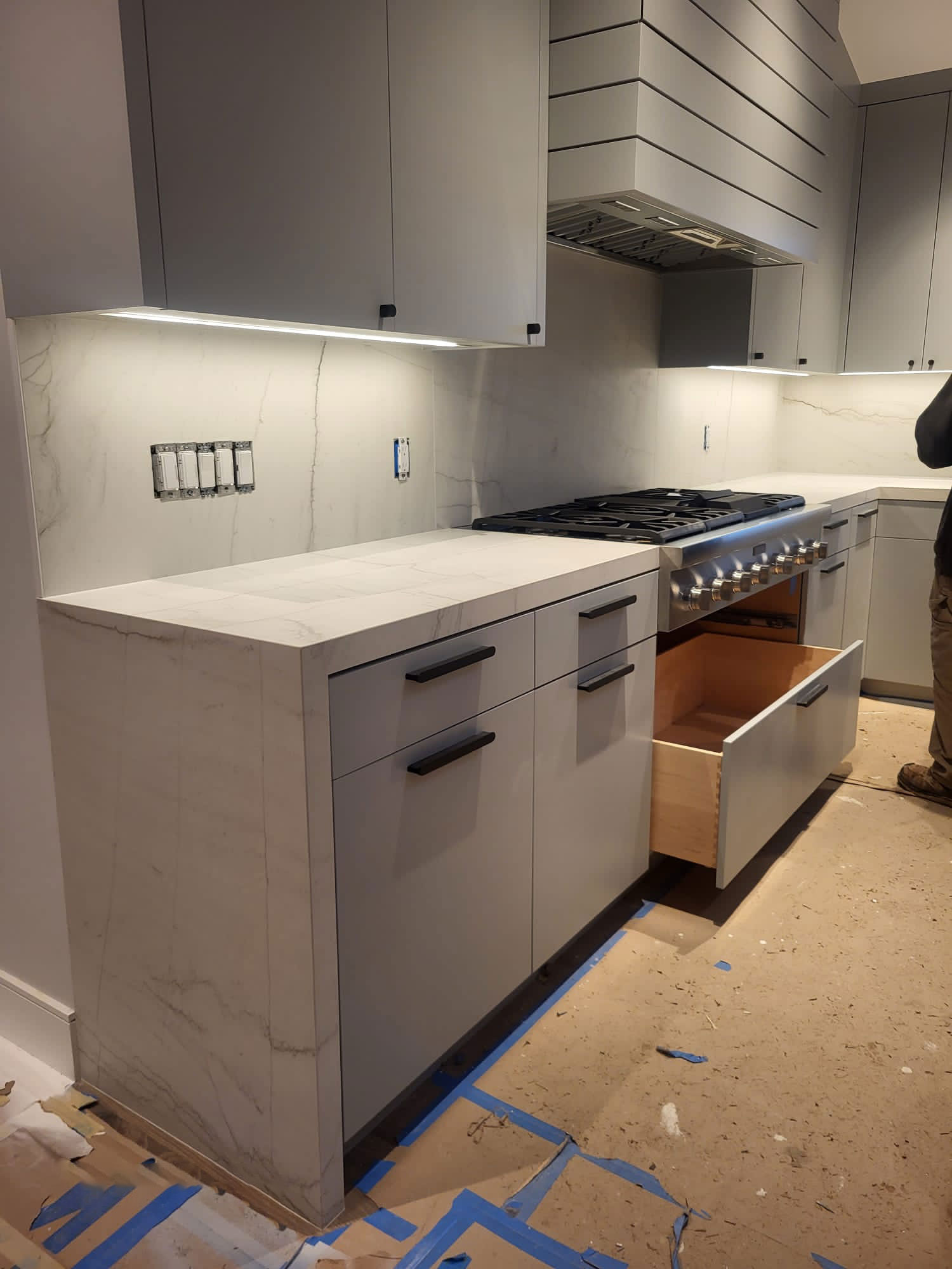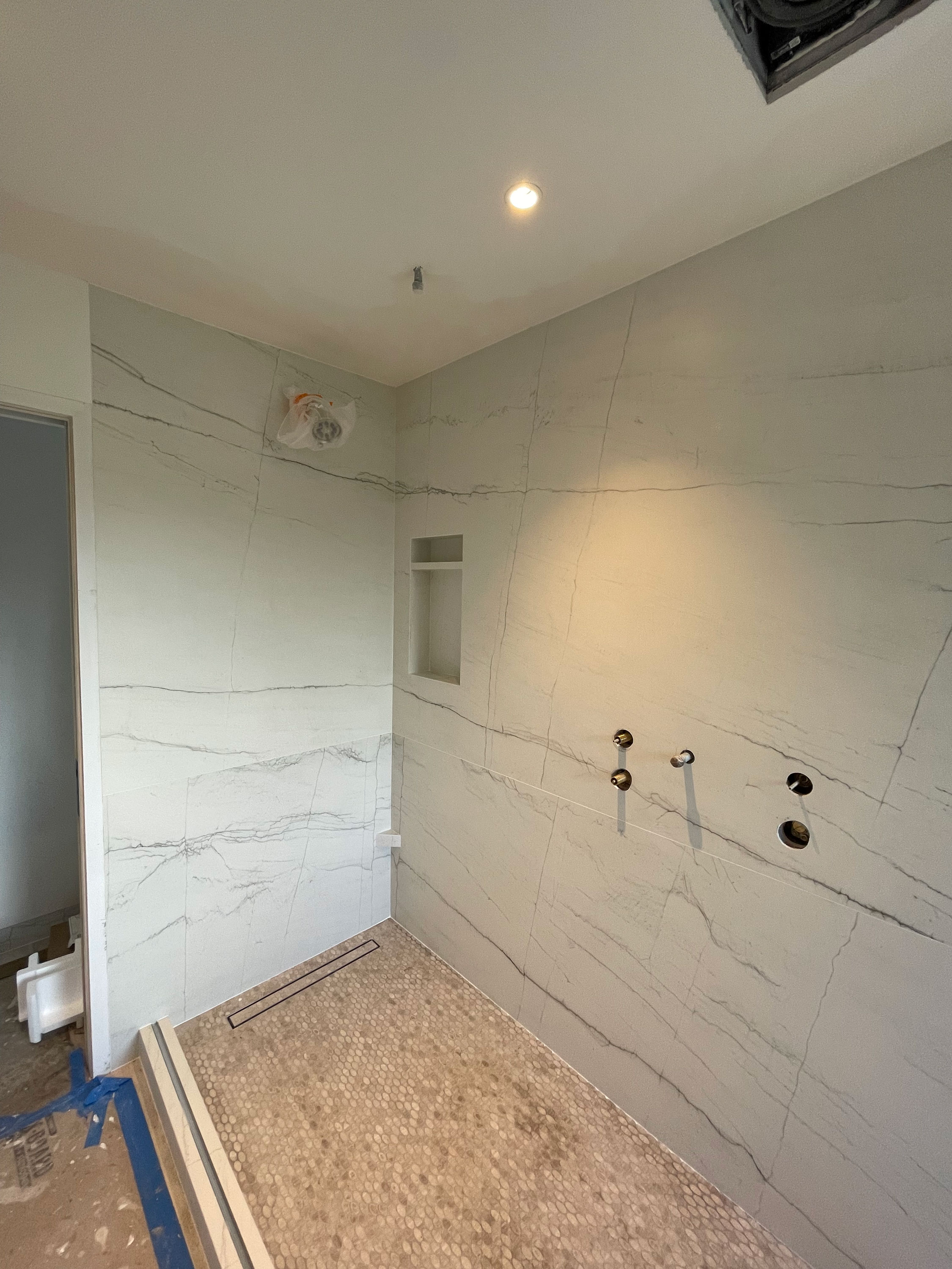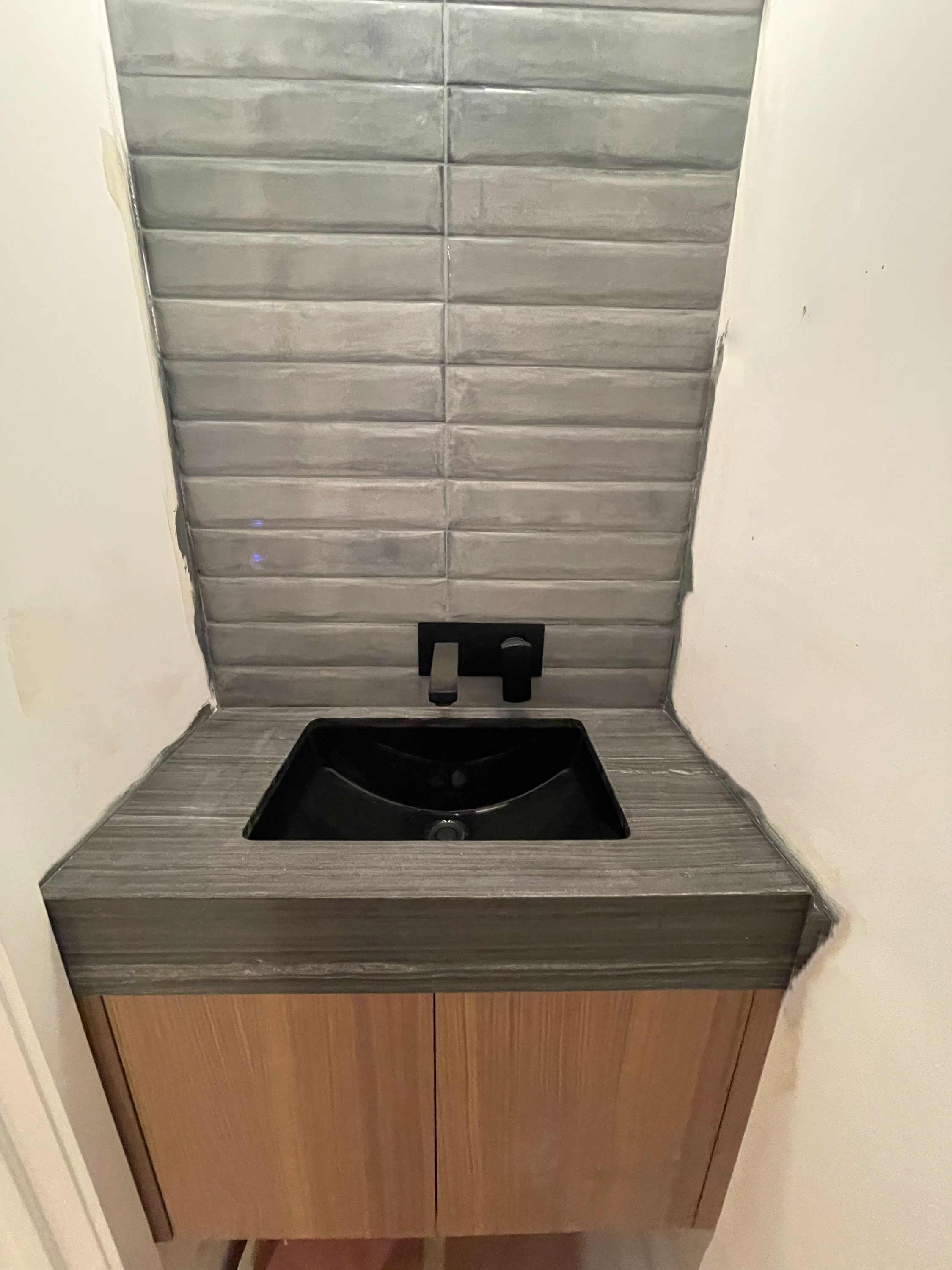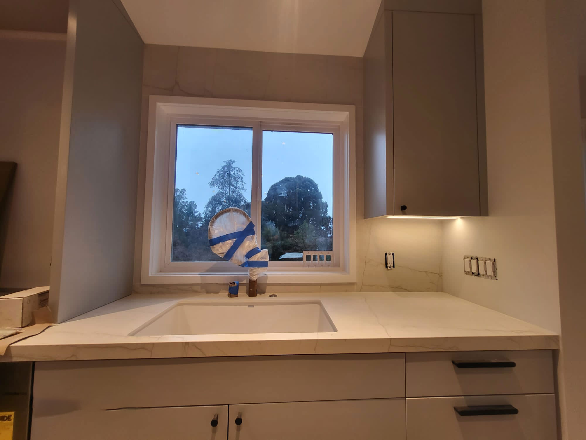 The installation process for both the kitchen and bathroom was handled with precision and care. In the kitchen, the quartz countertops were expertly installed to ensure seamless edges and a perfect fit with the cabinetry. The backsplash tiles were aligned meticulously to create a clean and continuous look. In the bathroom, the tile installation was carried out with attention to detail, ensuring even grout lines and a waterproof seal. The shower, vanity, and fixtures were all fitted to maintain a sleek, cohesive design that reflects the project's high standards.