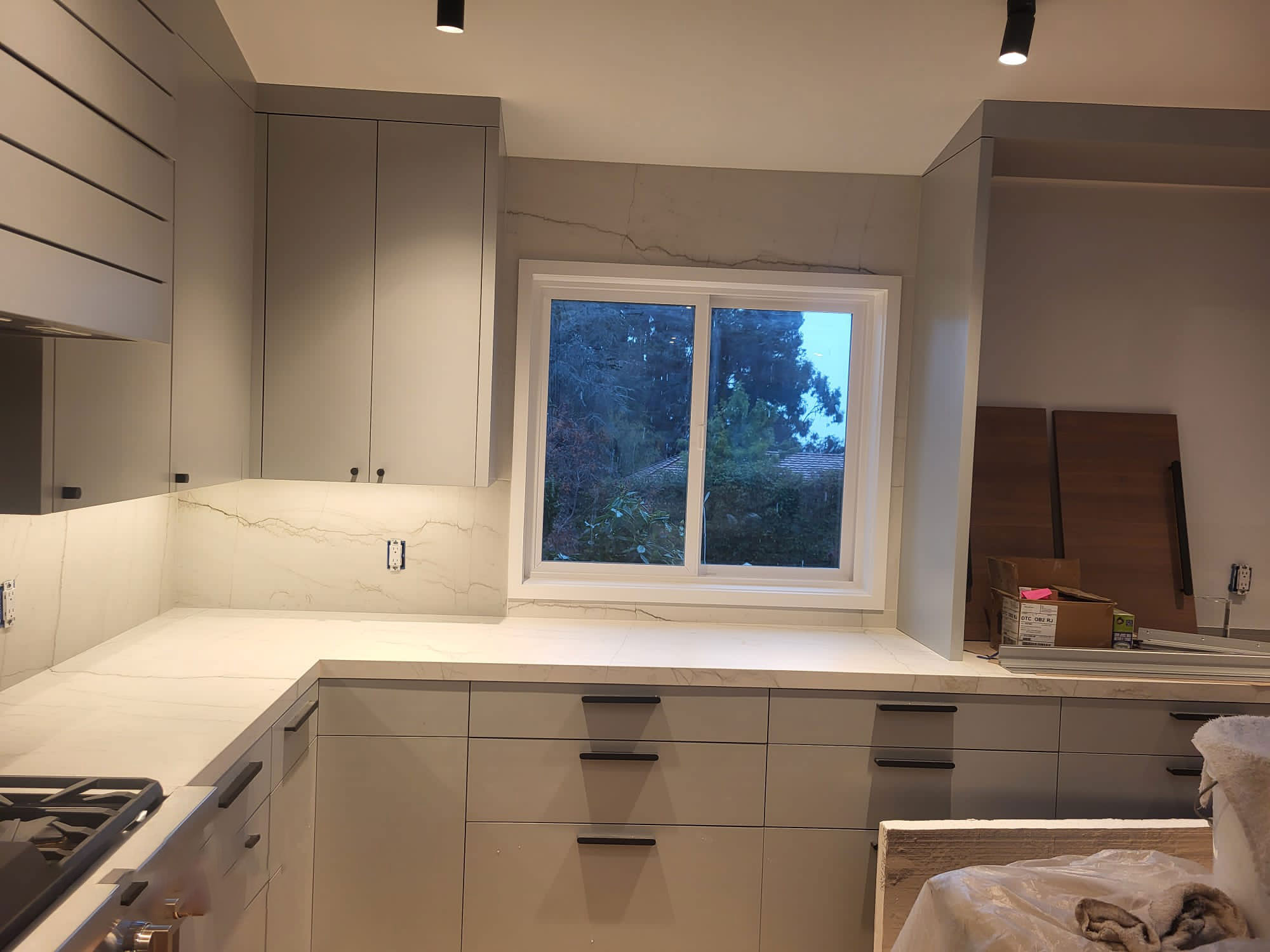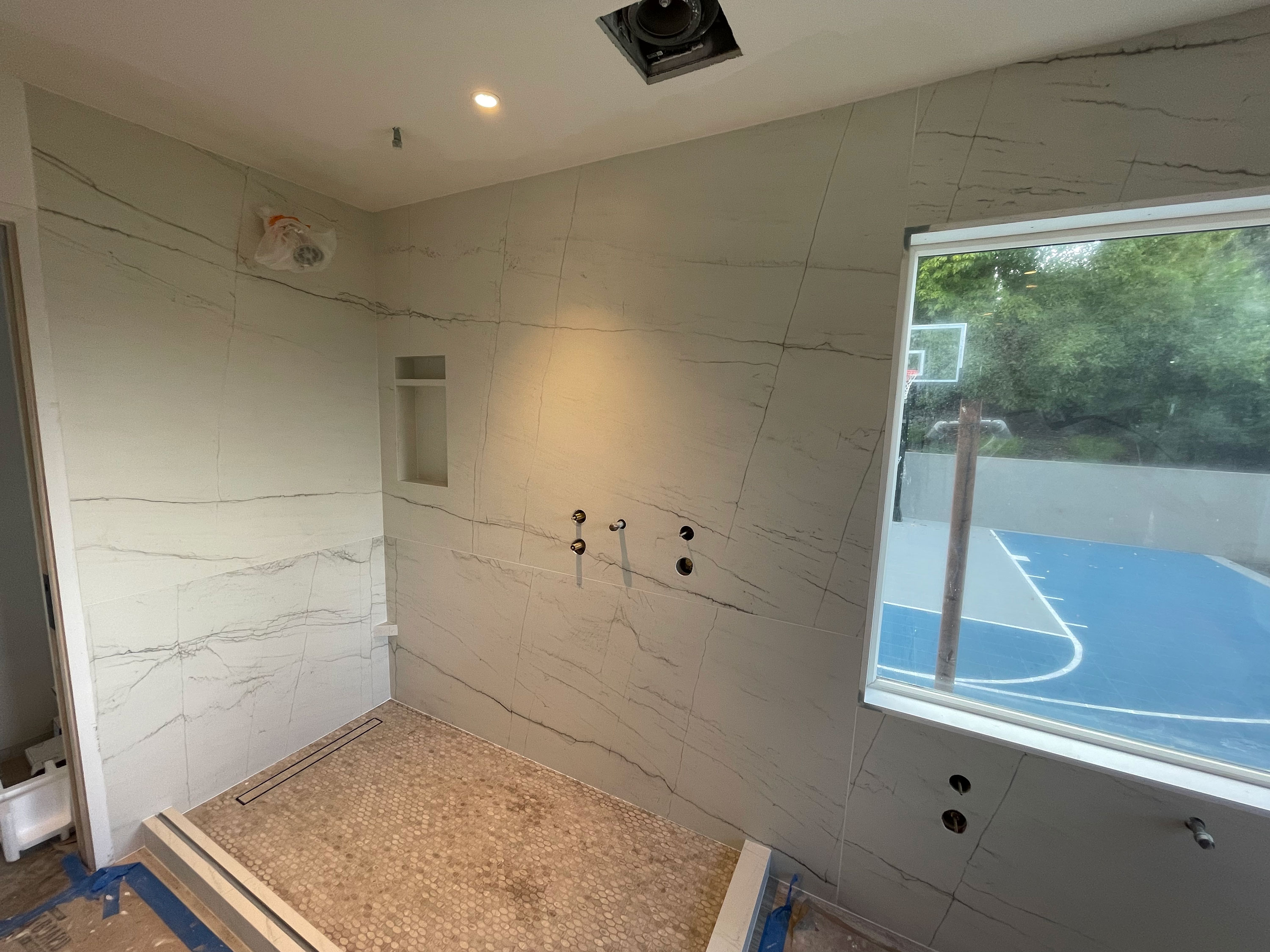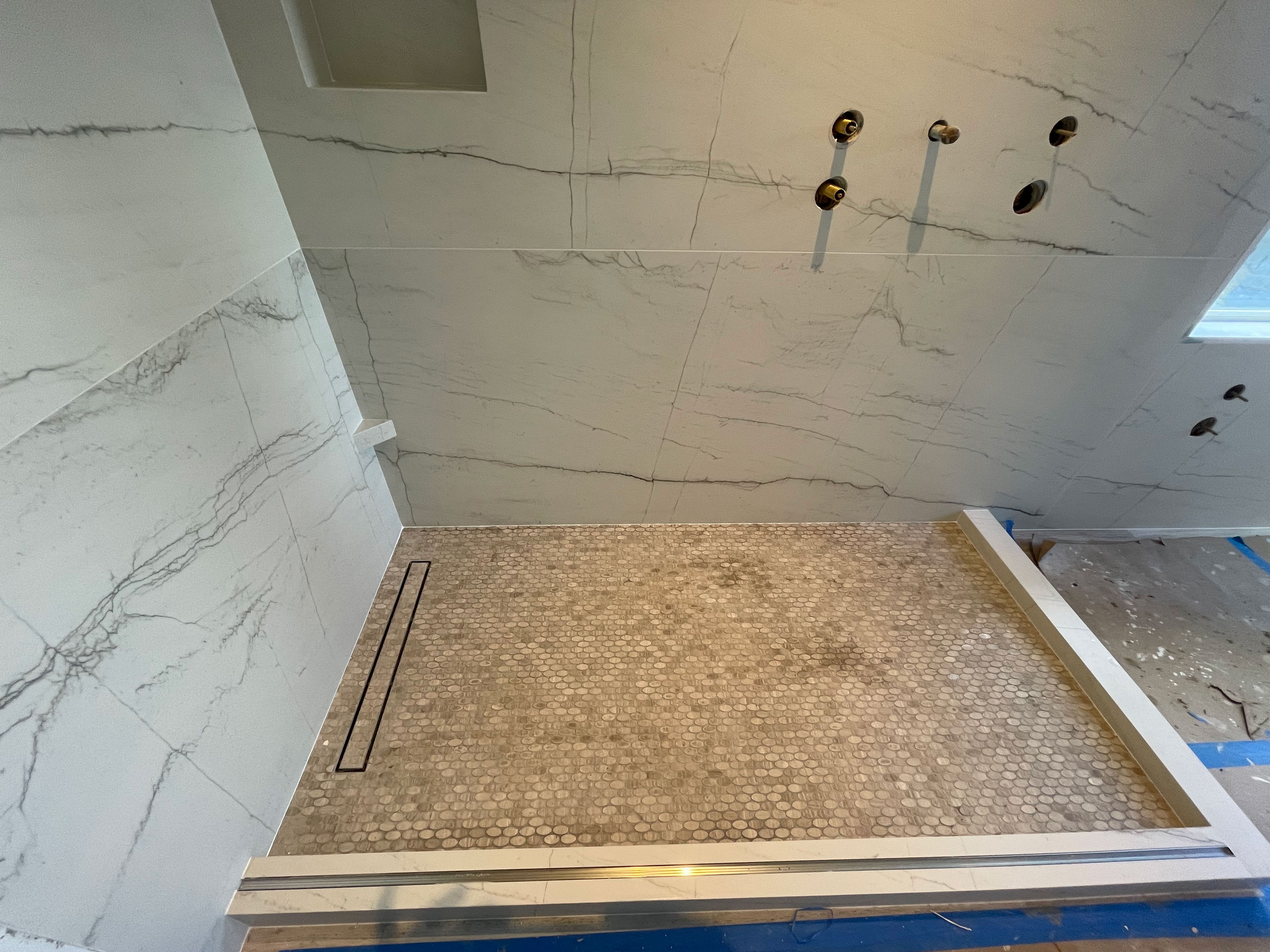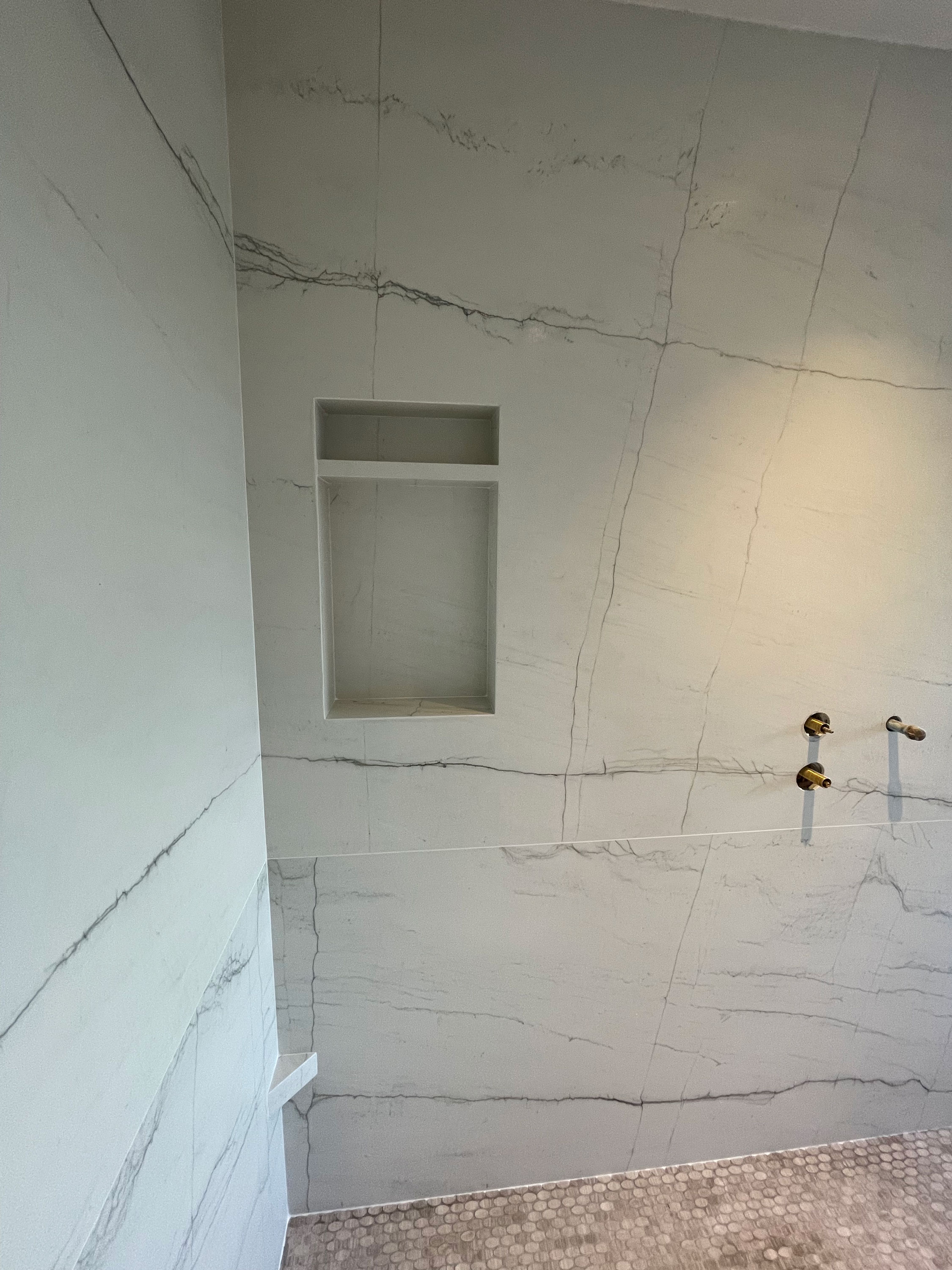 The installation process for both the kitchen and bathroom was handled with precision and care. In the kitchen, the quartz countertops were expertly installed to ensure seamless edges and a perfect fit with the cabinetry. The backsplash tiles were aligned meticulously to create a clean and continuous look. In the bathroom, the tile installation was carried out with attention to detail, ensuring even grout lines and a waterproof seal. The shower, vanity, and fixtures were all fitted to maintain a sleek, cohesive design that reflects the project's high standards.