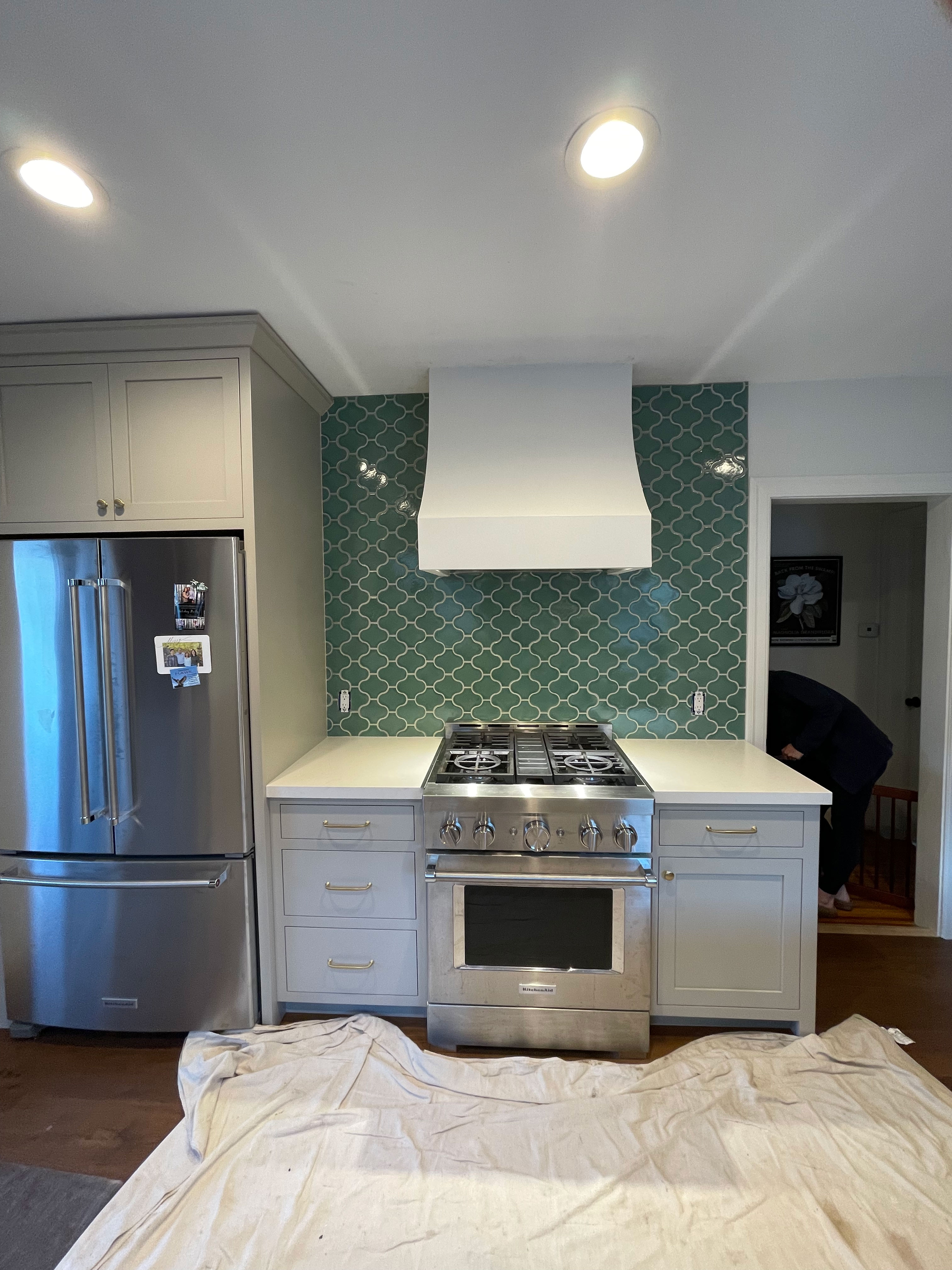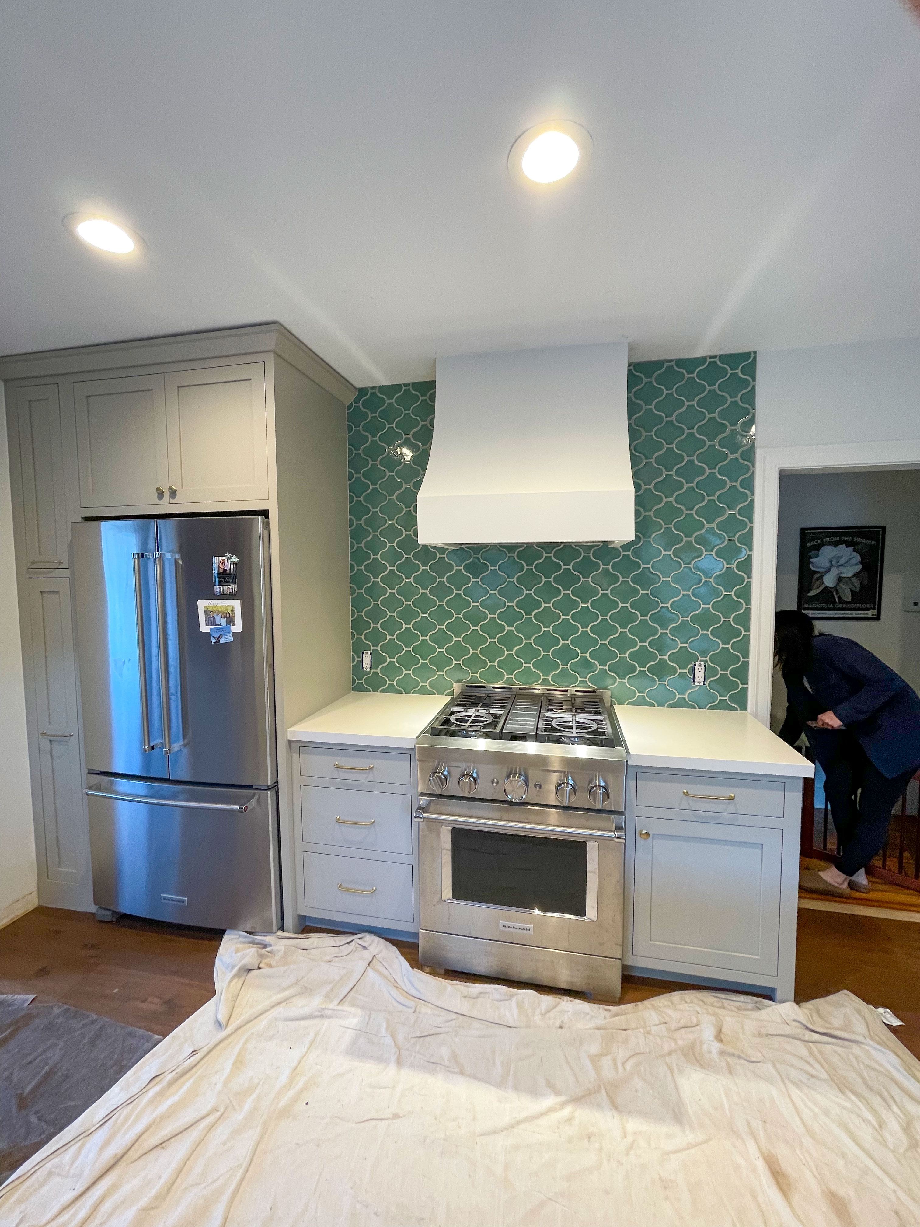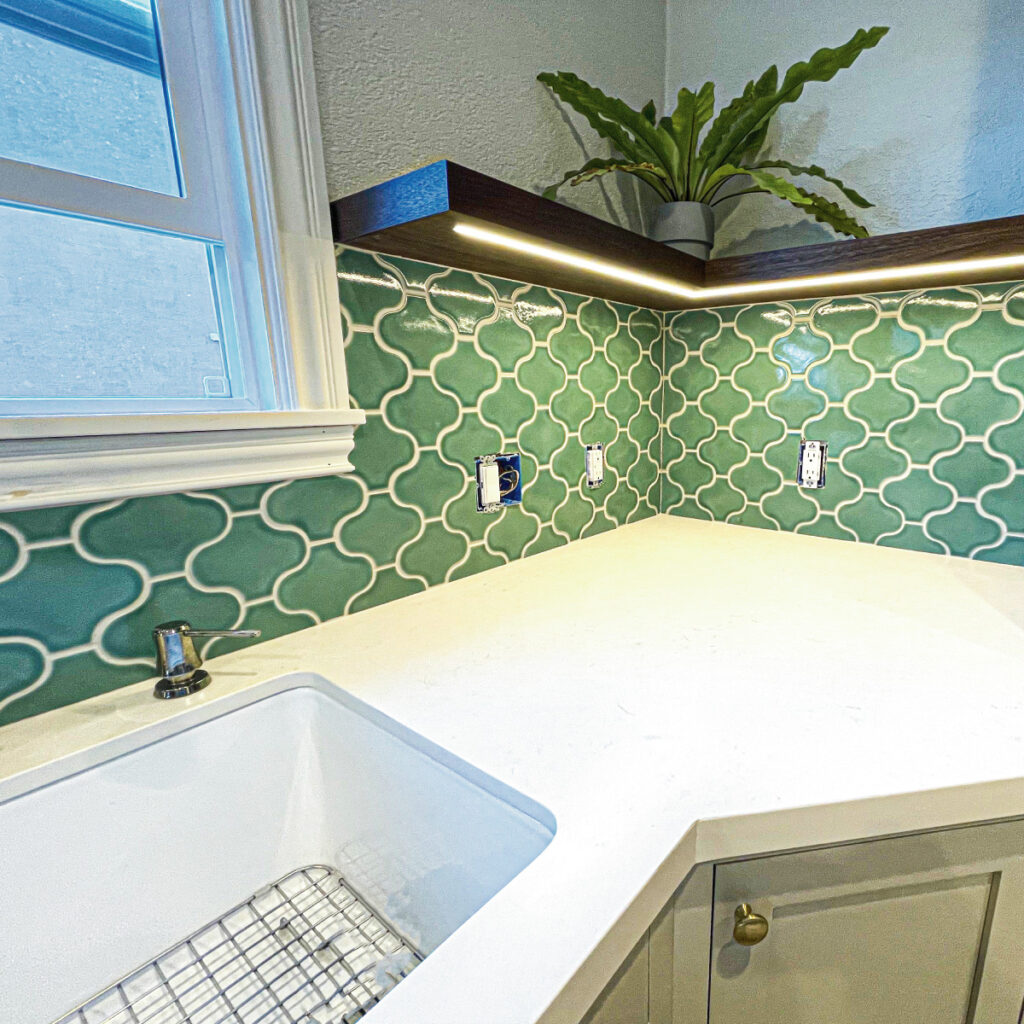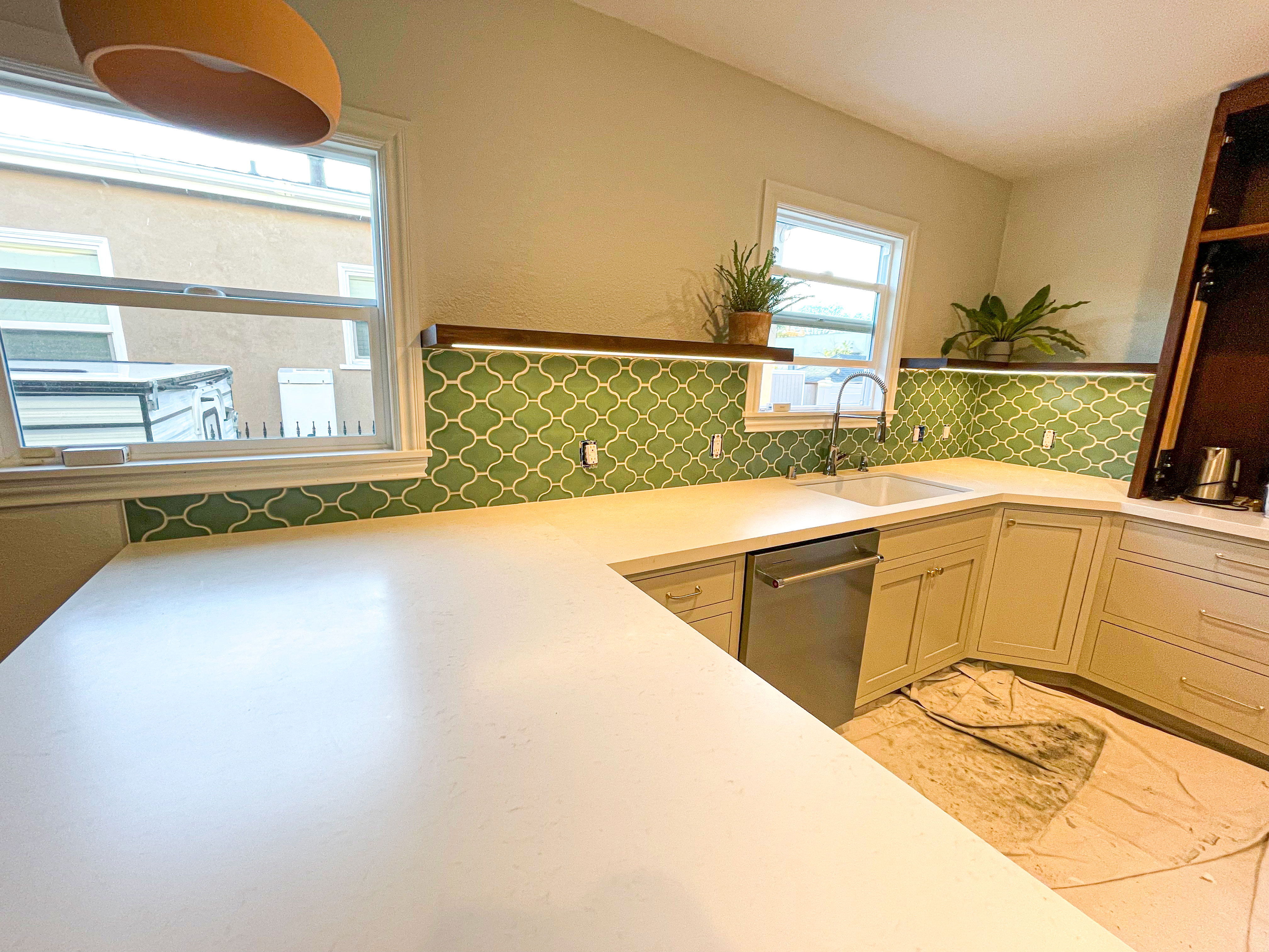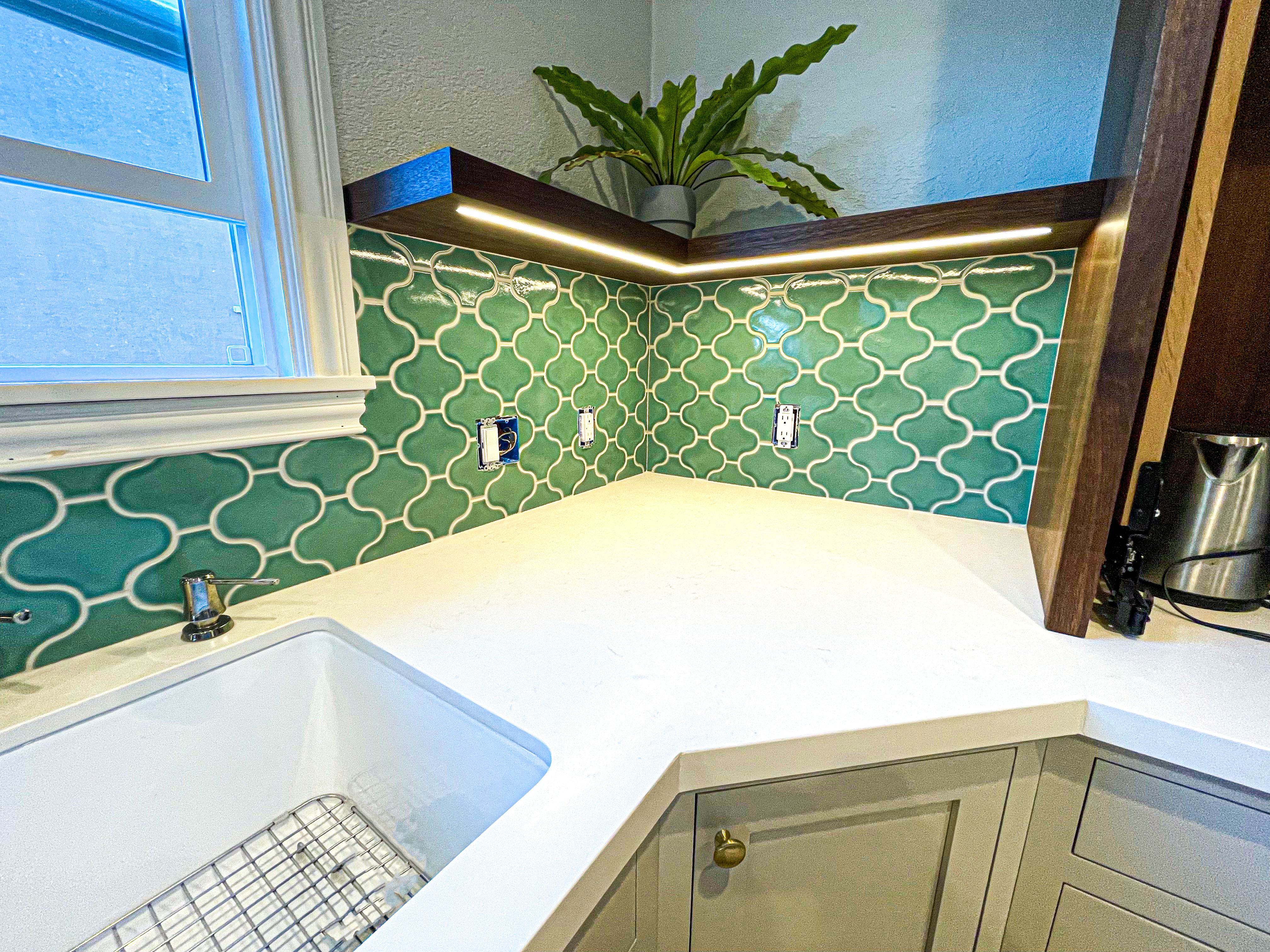 The installation process focused on precision and detail, particularly in aligning the green tiles to create a seamless and symmetrical backsplash. The wooden cabinetry was installed with care, ensuring perfect fit and finish, while the hardware and appliances were integrated to blend effortlessly with the overall design. Special attention was given to the lighting setup to highlight the unique color scheme and enhance the kitchen's ambiance.