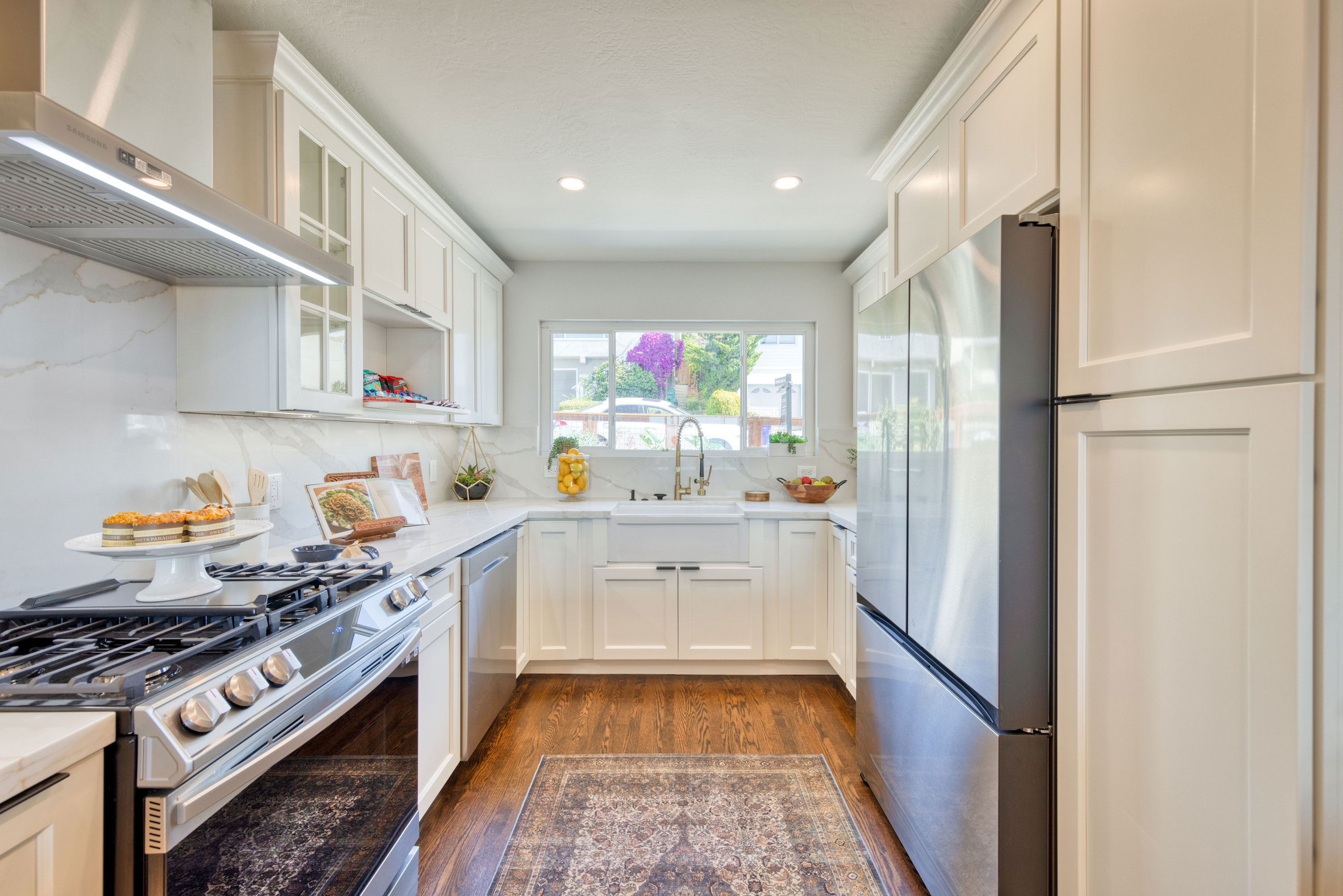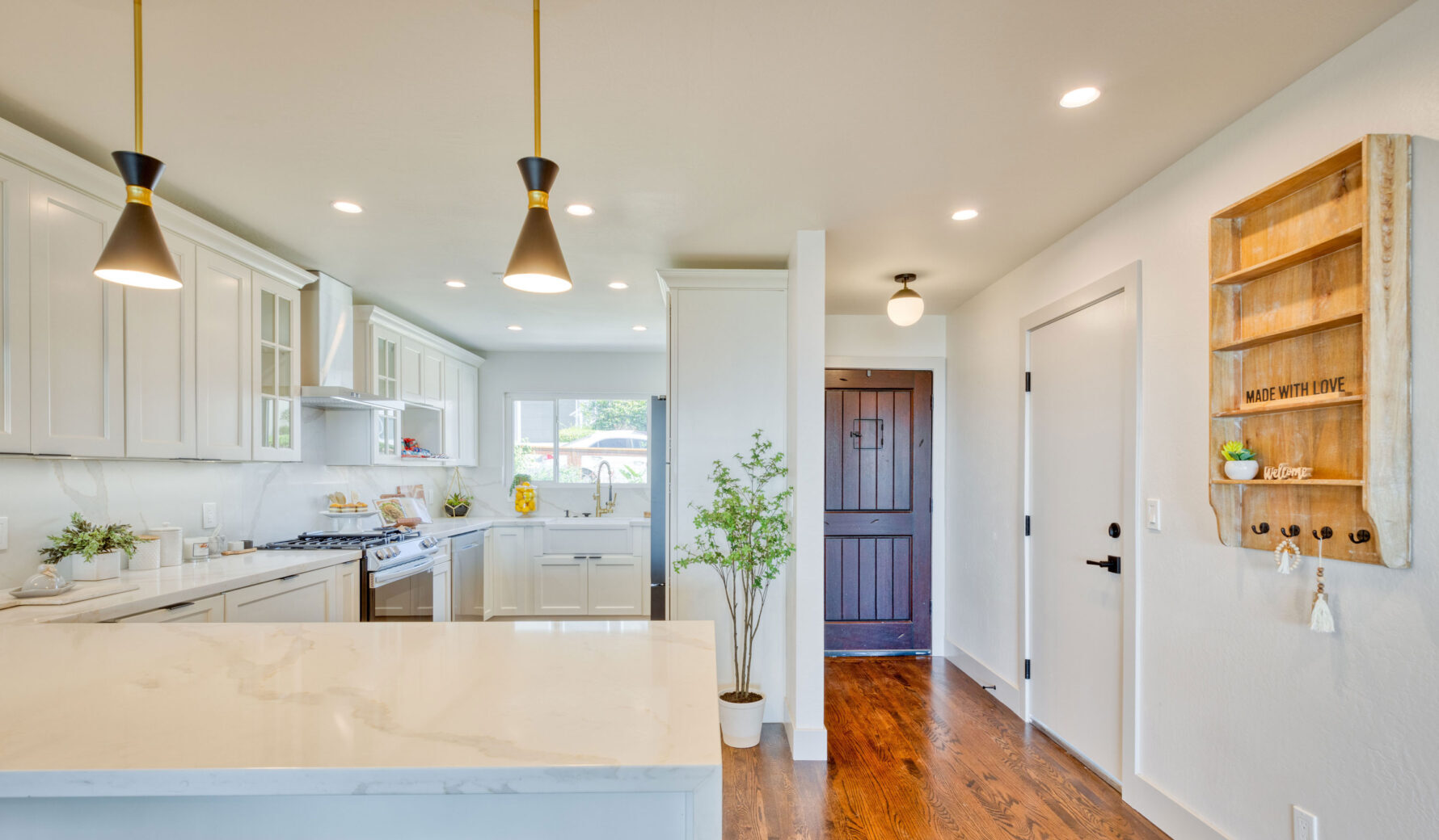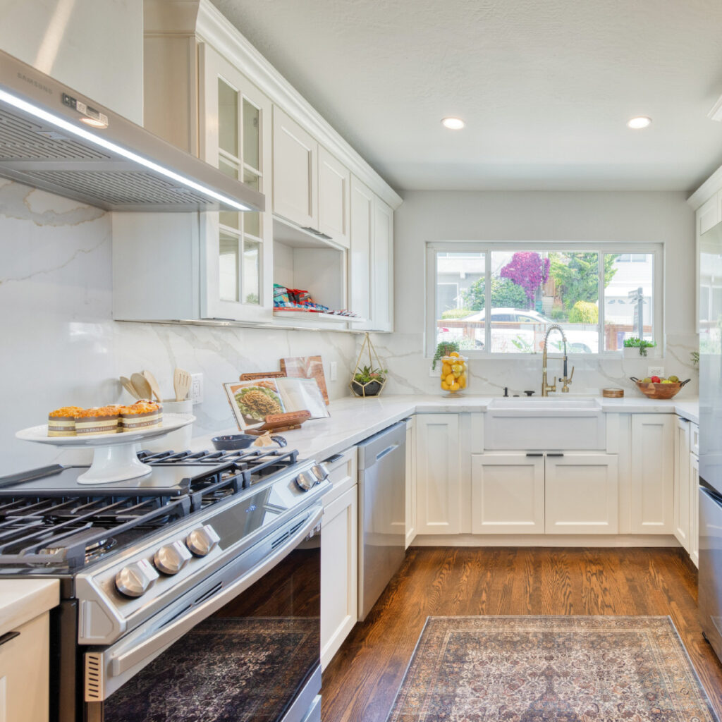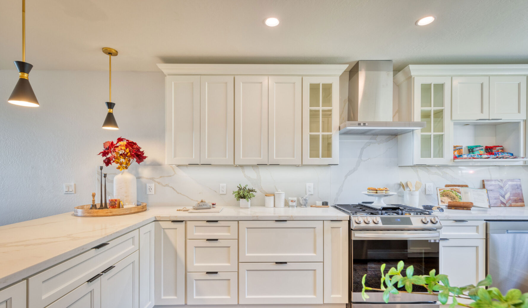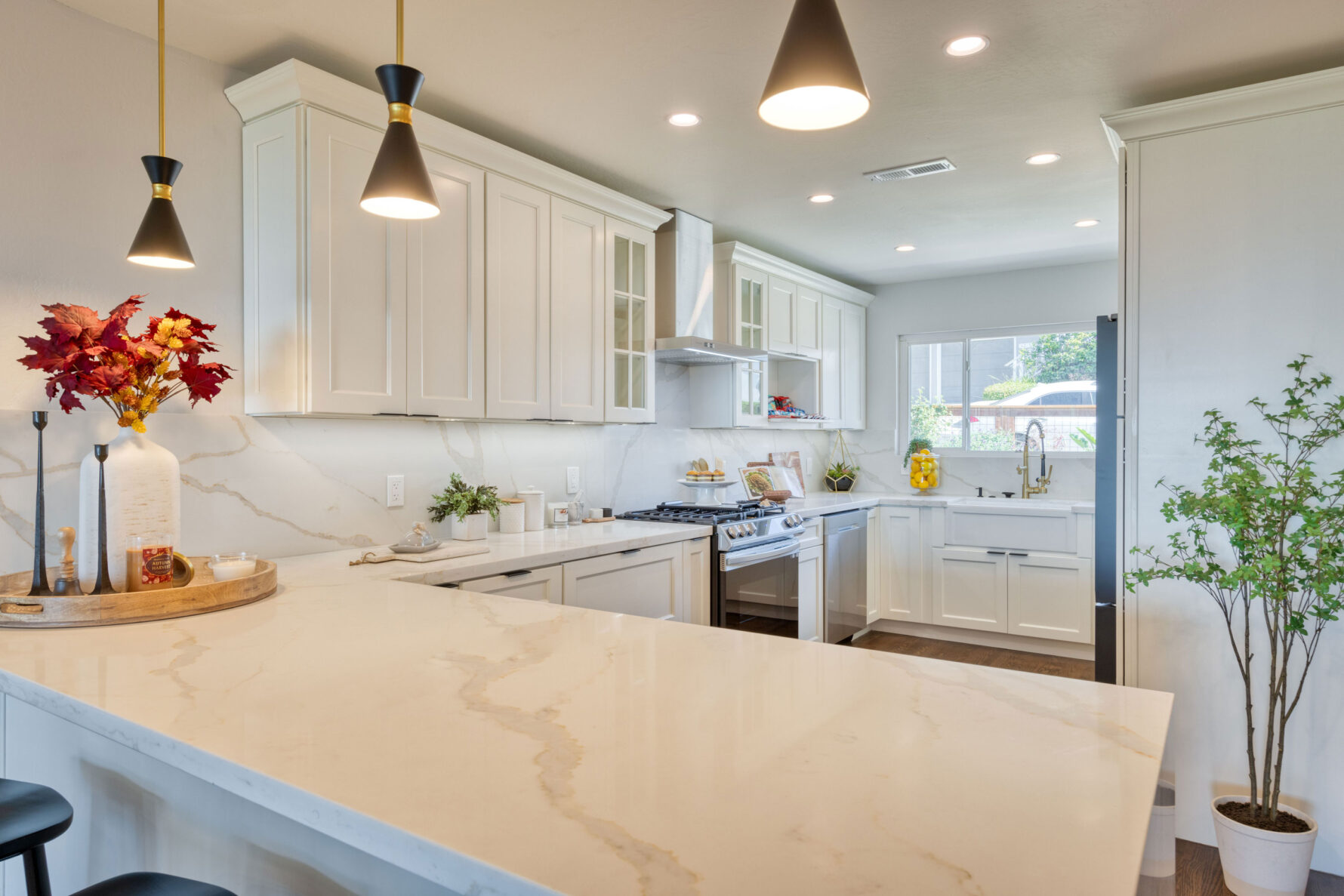 Custom-designed white cabinets with soft-close hinges, high-quality granite countertops with a polished finish, and strategically placed wooden elements for a touch of warmth. The kitchen features state-of-the-art appliances, including an integrated refrigerator and a built-in oven, all installed with precision to maintain a seamless look.